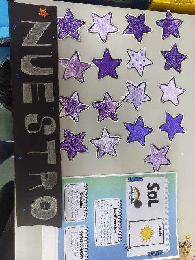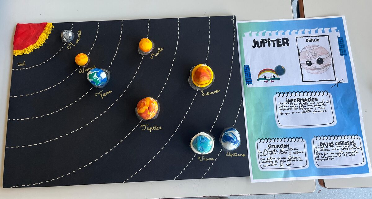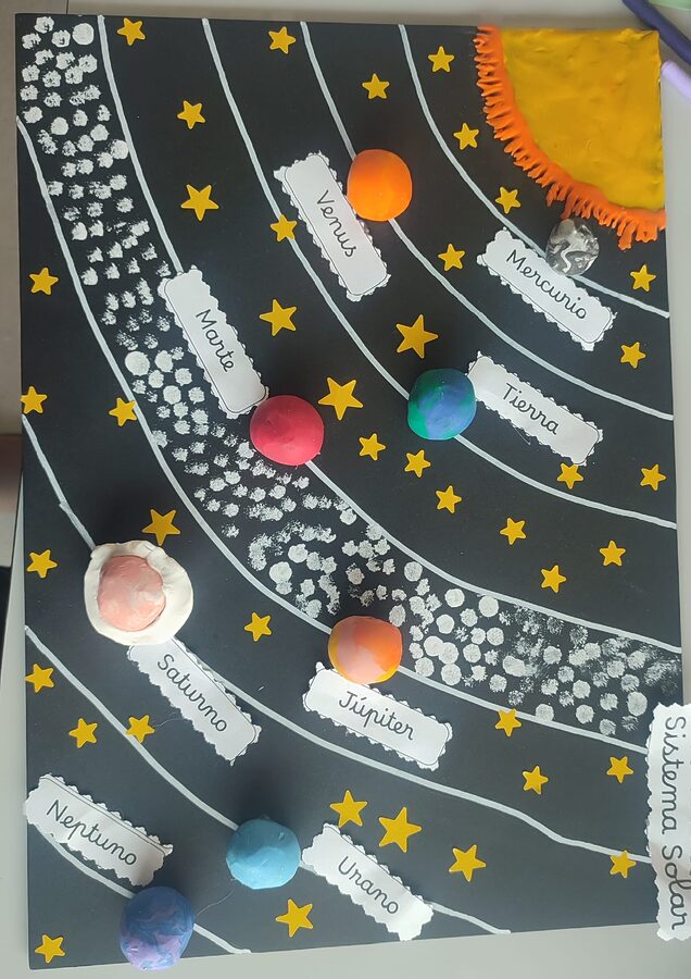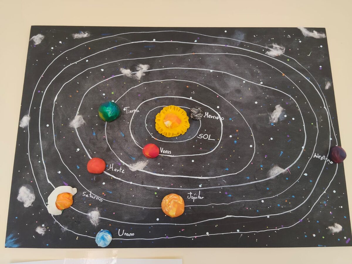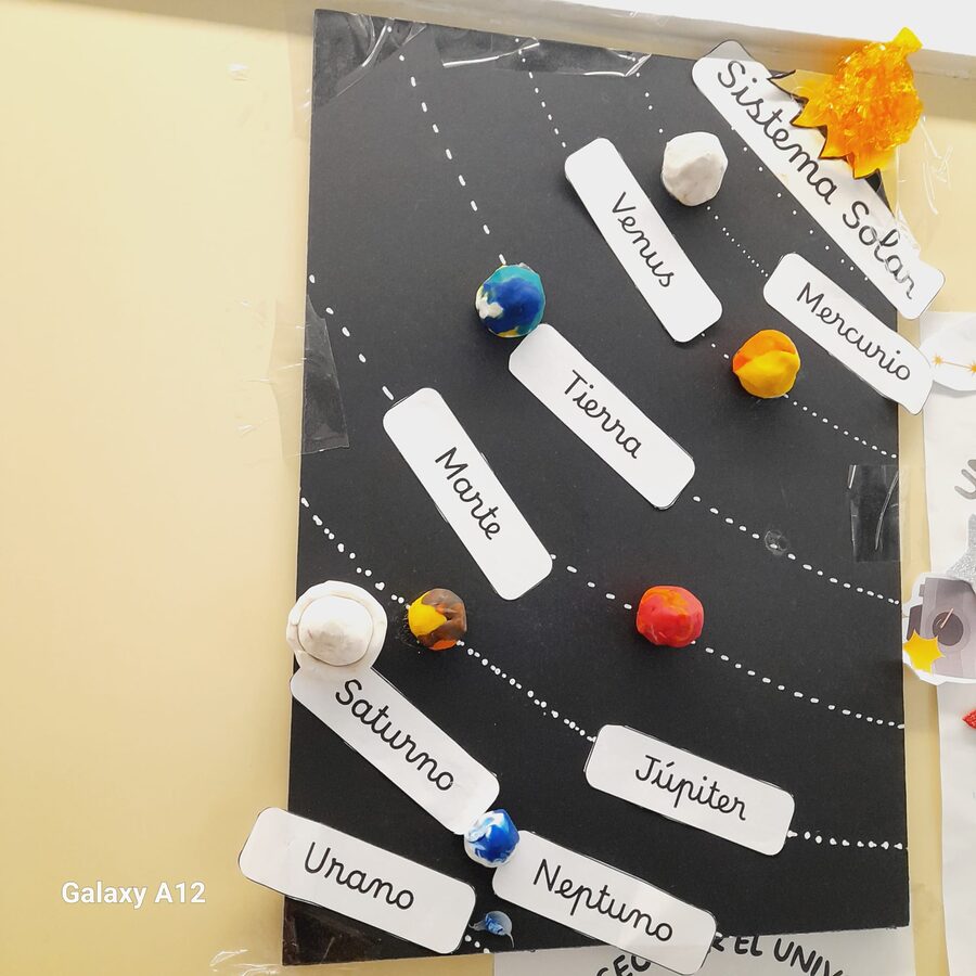 Realizamos diferentes actividades, como ver un cuento de Erita viajando con su cohete por el sistema solar y evitando peleas y discusiones. Buscamos información sobre los planetas y el sol, hicimos un sistema solar con plastilina, formamos una galaxia de estrellas moradas con una frase…