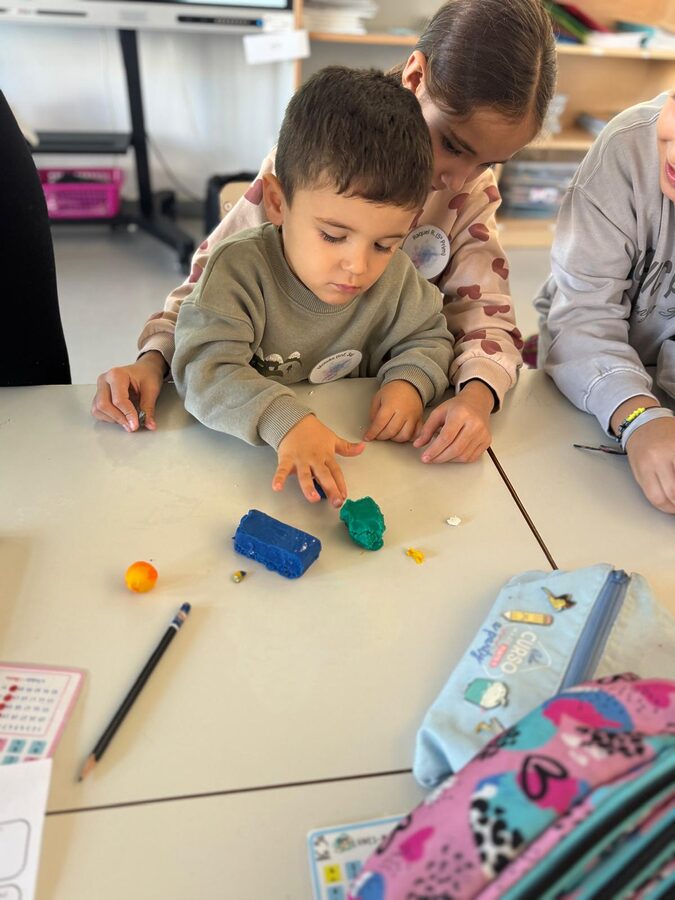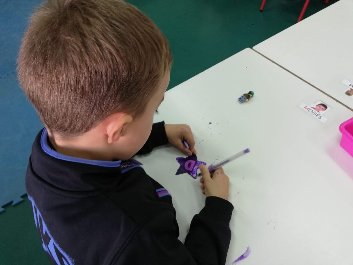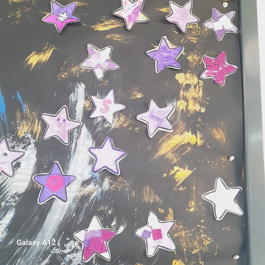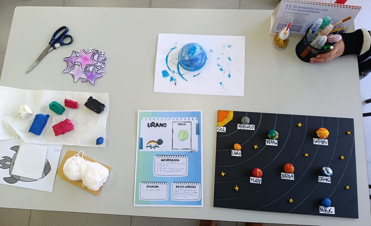 Realizamos diferentes actividades, como ver un cuento de Erita viajando con su cohete por el sistema solar y evitando peleas y discusiones. Buscamos información sobre los planetas y el sol, hicimos un sistema solar con plastilina, formamos una galaxia de estrellas moradas con una frase…